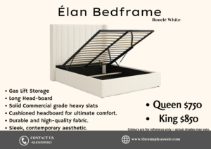 The Élan Bedframe in bouclé White offers a clean, fresh look that elevates any bedroom. With a long cushioned headboard and solid commercial-grade slats, it’s designed for ultimate support and style. Its gas lift system reveals spacious under-bed storage, making it ideal for modern homes.