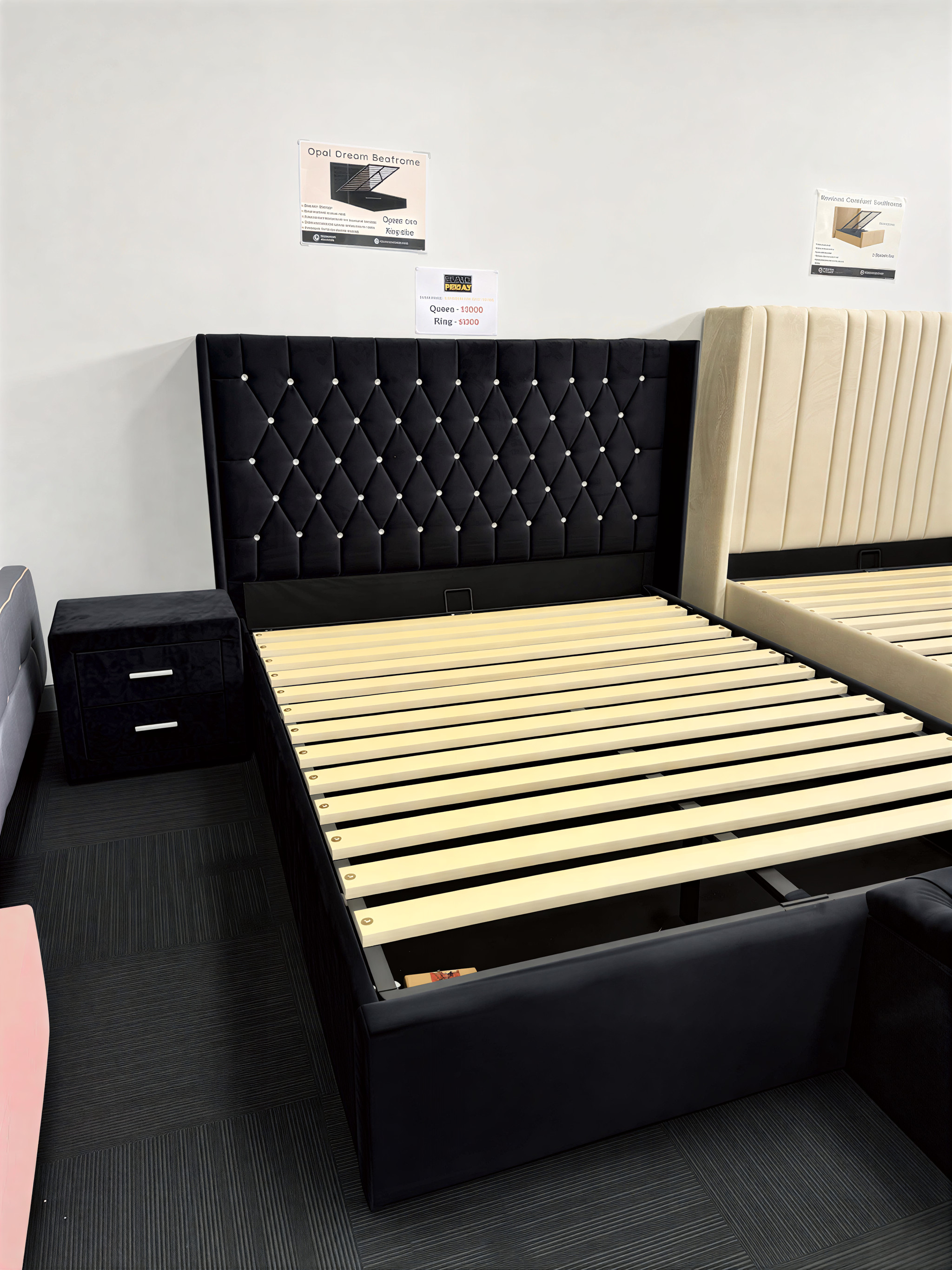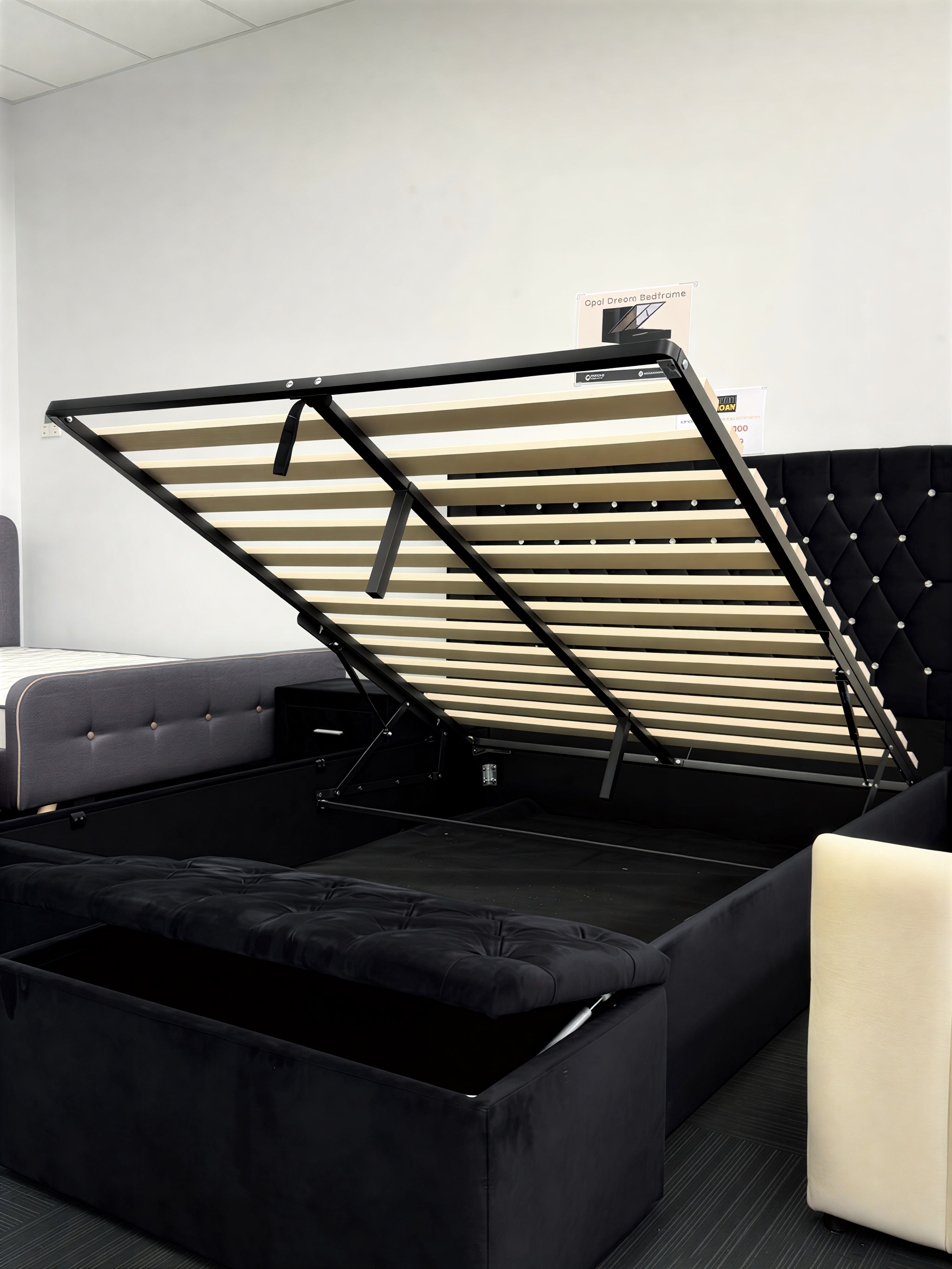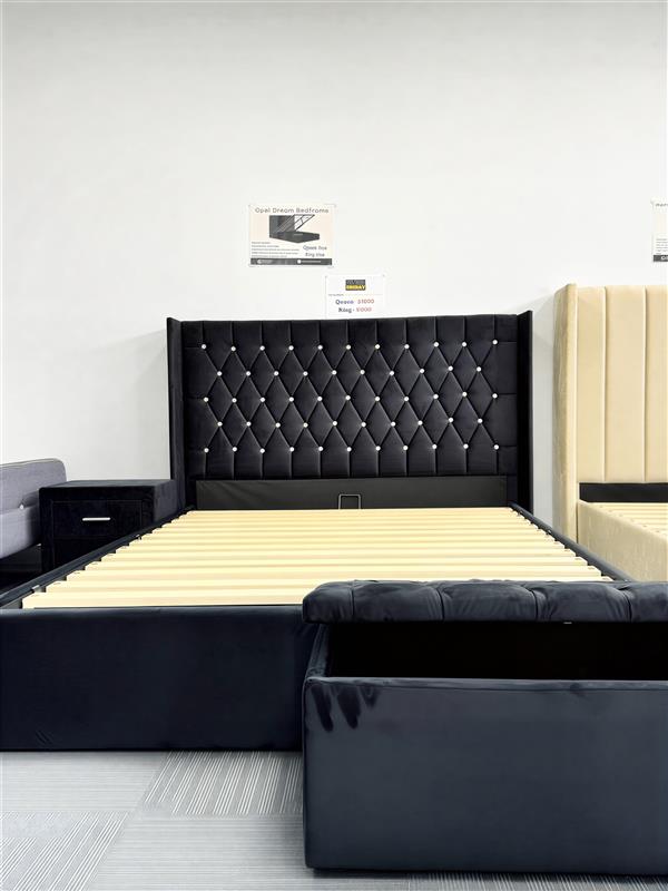 The Opal Dream Bedframe is more than just stunning — it’s designed for practical living. With embroidered diamond-tufting on rich black velvet and a gas lift base that opens to generous storage, this bedframe is ideal for stylish homes with a need for space efficiency.